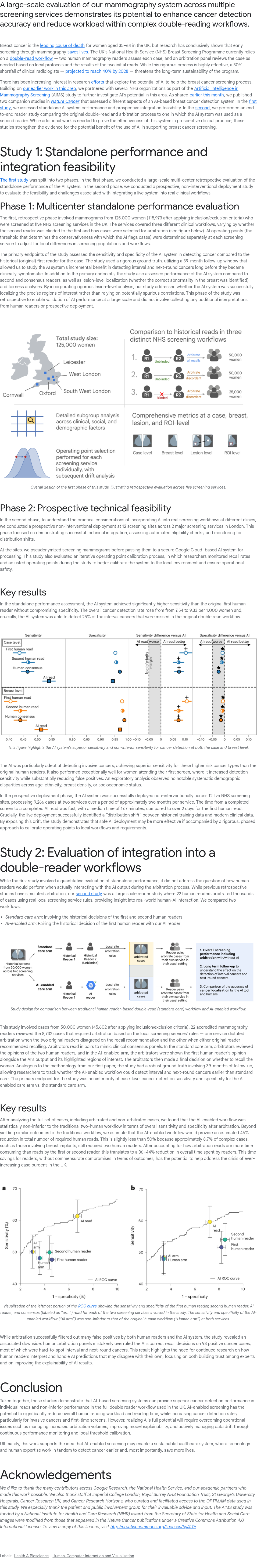 本研究对大规模乳腺X线筛查系统进行了多中心评估,证实其可提升癌症检出准确率并减轻双人阅片工作负荷。乳腺癌是英国35–64岁女性首要死因,早期钼靶筛查已被证实可显著降低死亡率。目前英国NHS乳腺筛查项目采用双人阅片制,必要时由仲裁小组复核,虽效果优异,但临床放射科医生短缺达30%,预计2028年将升至40%,严重威胁项目可持续性。AI辅助阅片成为重要突破口,本研究基于前期工作,探索AI在真实筛查流程中的临床价值与落地潜力。(200字)
