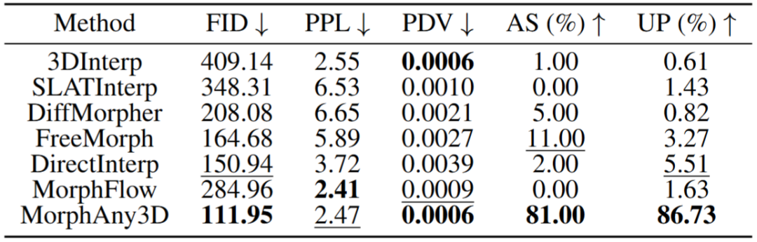 作者将MorphAny3D与四类基准方法对比:(1) 基于匹配的3D/SLAT变形(3DInterp和SLATInterp);(2) 经Trellis升维至3D的2D变形(DiffMorpher[3]和FreeMorph[5]);(3) 直接插值(DirectInterp);(4) MorphFlow[6]。评测指标包括:(a) 衡量合理性的FID;(b) 评估平滑度与时序均匀性的PPL/PDV;(c) 基于VLM的审美得分(AS);(d) 调查问卷获取的用户偏好(UP)。