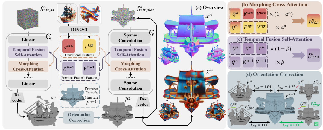 图2-(a) 展示了MorphAny3D的框架。基于作者在交叉/自注意力模块中观察到的SLAT融合规律,作者引入了变形交叉注意力模块(Morphing Cross-Attention, MCA, 图2-(b))和时序融合自注意力模块(Temporal-Fused Self-Attention, TFSA, 图2-(c))以提升变形的合理性与时序连贯性。此外,作者还提出了一种位姿修正策略(Orientation Correction, OC, 图2-(d)),该策略基于对Trellis生成结果位姿分布的统计分析,旨在抑制突发的位姿跳变。