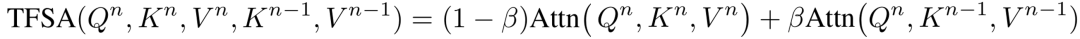 与KV-Fused SA直接在注意力计算前融合键值不同,TFSA 采用了一种后向的时序约束策略。在生成第帧时,TFSA 将当前帧和前一帧的键和值的注意力输出融合: