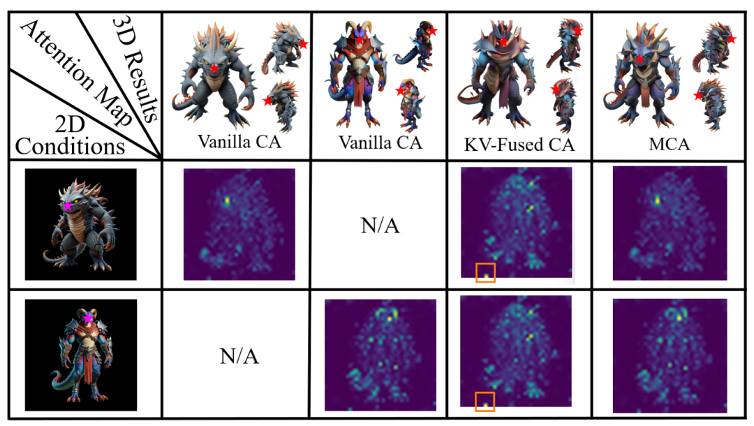 图4:不同交叉注意力机制下的注意力图。红星标记的是头部SLAT,粉红星标记的是对应的头部图像条件。橙色框高亮了KV-Fused CA的不正确的注意力焦点。而MCA保留了正确的、语义一致的注意力,进而避免了如图2-(d) 所示的KV-Fused CA的局部扭曲结构。