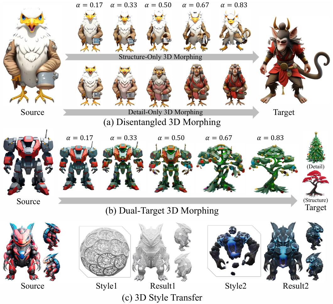 (1)结构-细节解耦三维变形(Decoupled 3D Morphing):如图7-(a) 所示,通过在Trellis的不同生成阶段有选择地应用上述组件,用户可以实现全局几何结构与局部表面细节的独立解耦控制,从而精准把控变形效果。