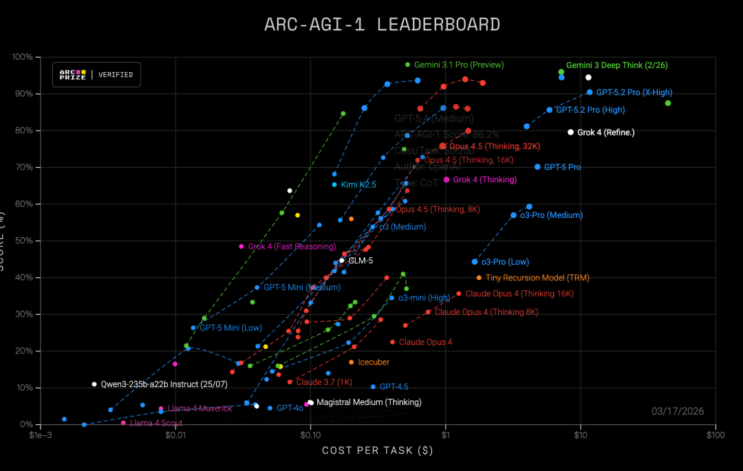 如果再看ARC-AGI-1,变化会更加夸张。
