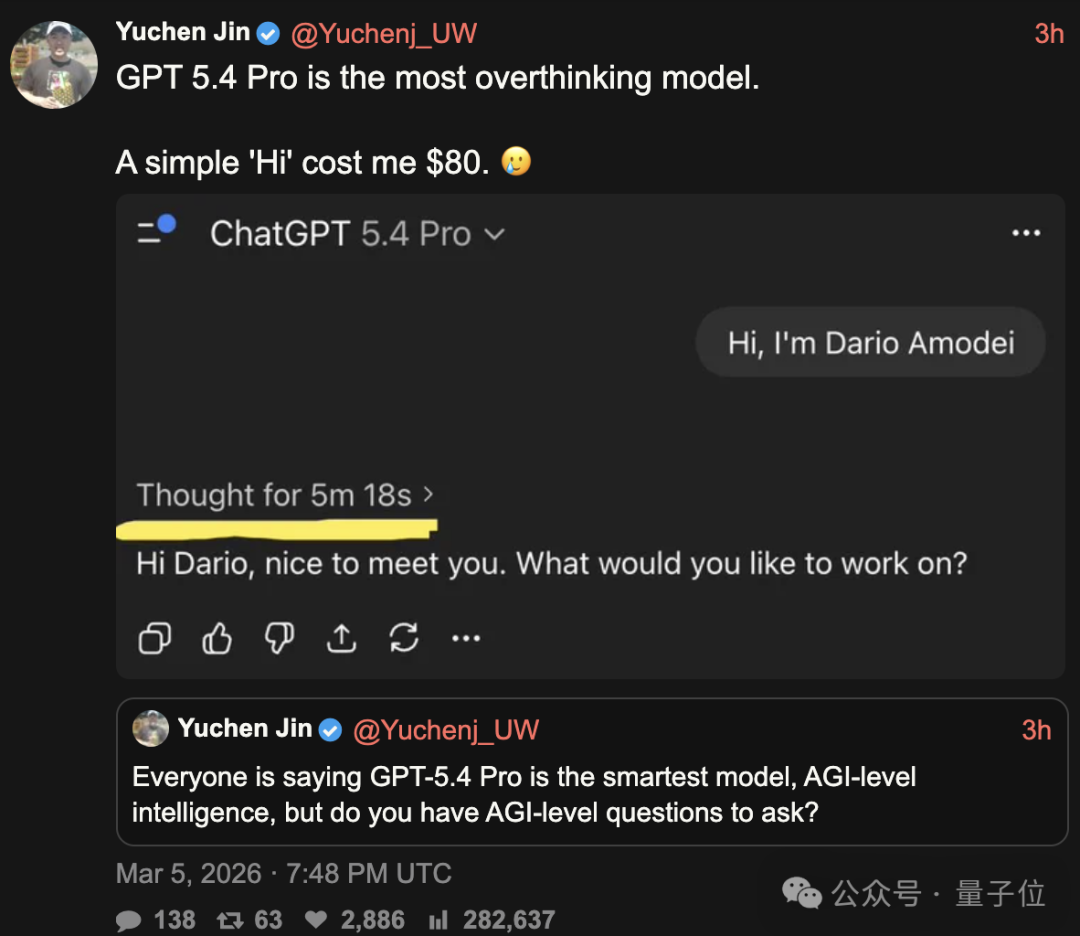 早在模型刚上线的时候,知名博主YuChen Jin仅仅对着GPT-5.4 Pro说了一句“Hi,俺是Anthropic创始人”,就花掉了整整80刀。