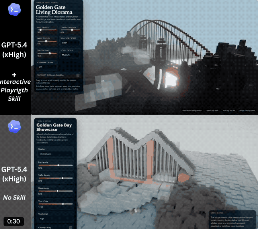 还有网友测试了新的交互式剧本创作技能,该技能的作用是利用GPT-5.4的计算机操作能力来查看和浏览用户界面。在同一提示词下,使用技能后创建出的场景显然更加连贯、细节更丰富、保真度更高。