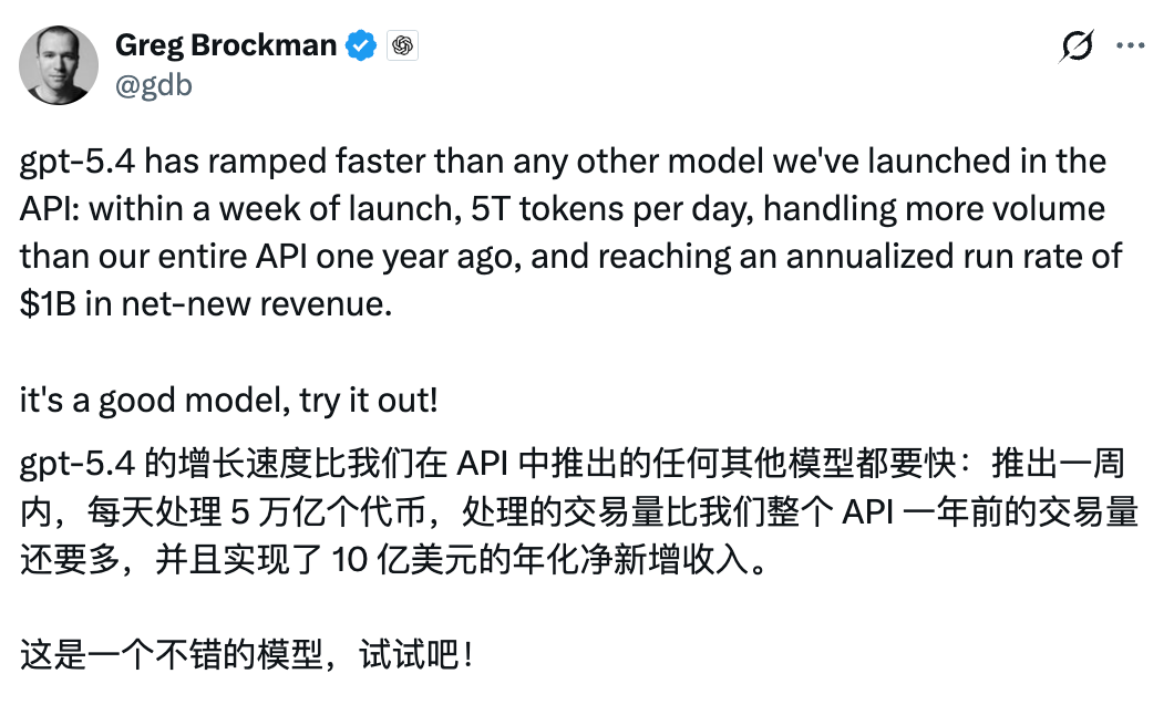 据OpenAI总裁Greg最新披露,GPT-5.4仅上线一周,每天处理约5万亿token,带来10亿美元年化净新增收入。