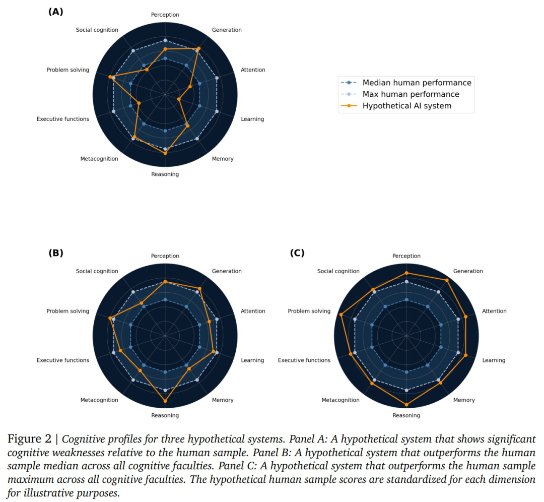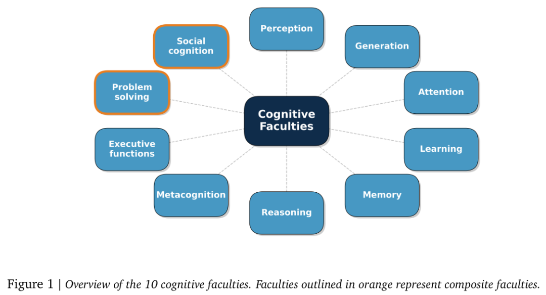 具体来说,AGI的评估被细化为10个关键的认知领域,包括感知、生成、注意力、学习、记忆、推理、元认知、执行功能、问题解决以及社会认知。