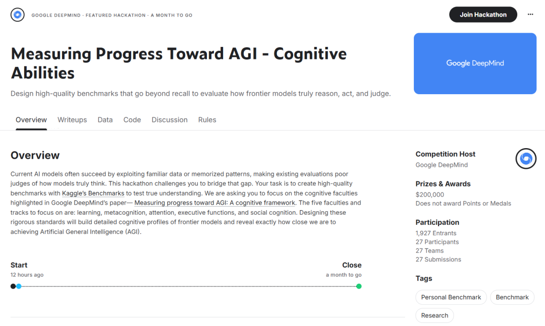 与论文同步推出的Kaggle黑客松,精准瞄向评估缺口最大的5种认知能力:学习、元认知、注意力、执行功能、社会认知。
