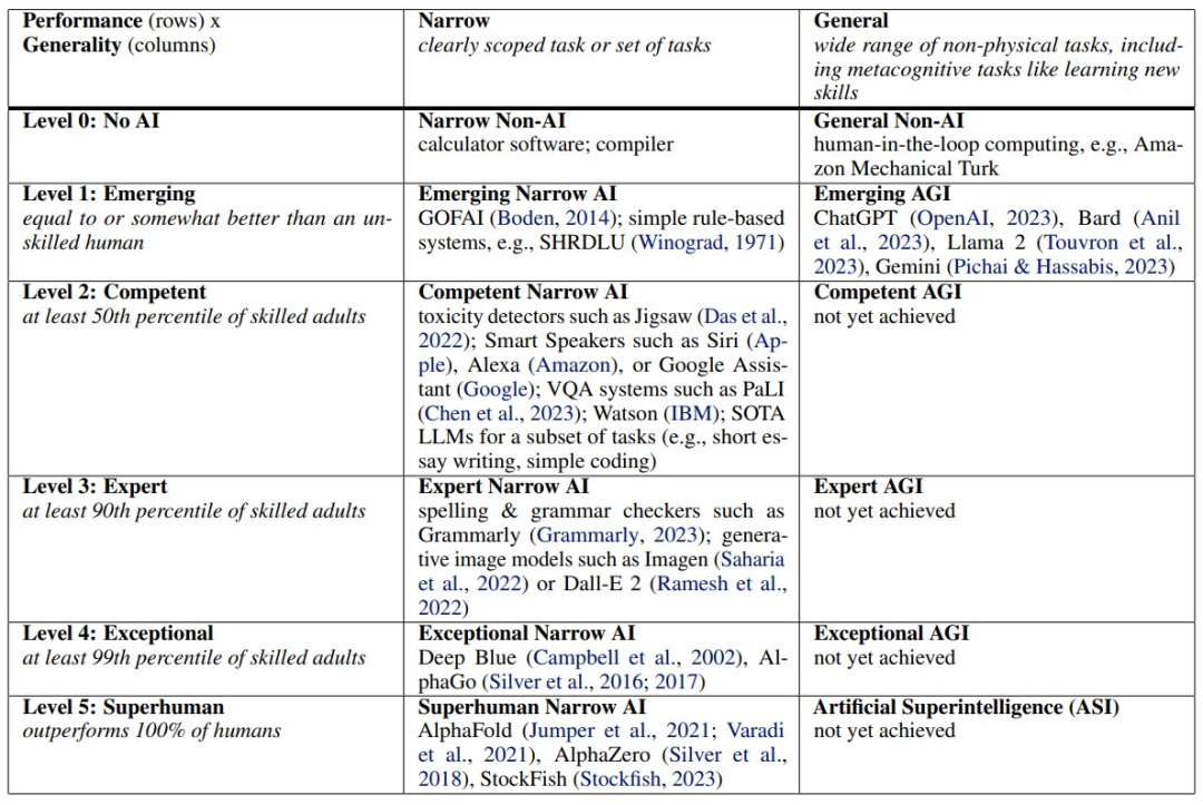 2023年,同一个团队发表了著名的「Levels of AGI」框架,把通往AGI的路拆成了5个性能等级。