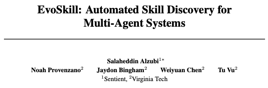 针对这一局限,来自 Sentient 与弗吉尼亚理工的研究团队提出了 EvoSkill 框架,一个能通过失败分析自动发现并优化 Agent Skills 的自我进化系统。