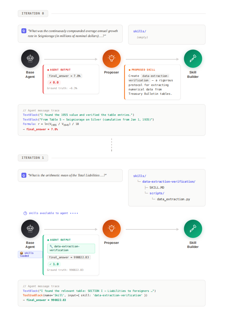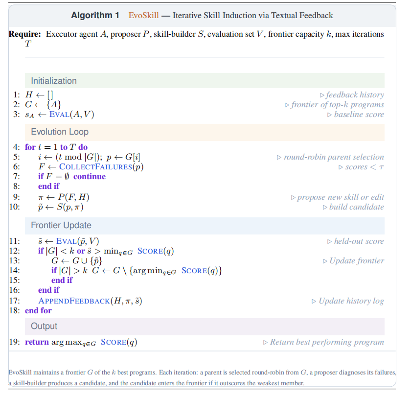 图 | EvoSkill——基于文本反馈的迭代 Skills 归纳。