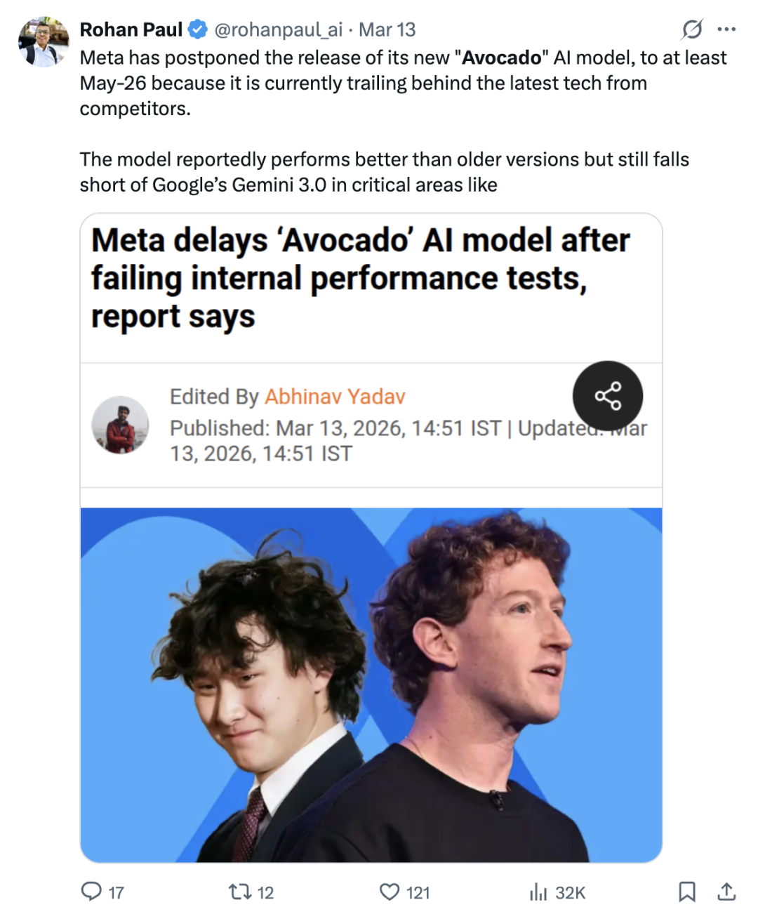 先是去年重金组建的Meta超级智能实验室(MSL) 的模型“牛油果”难产,被爆料性能甚至不如谷歌去年发布的Gemini 3,导致发布又又将延期——