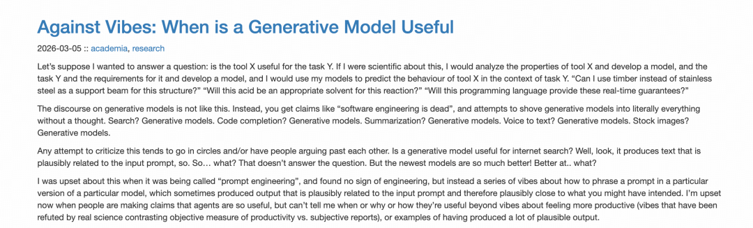 近期,一篇题为(Against Vibes: When is a Generative Model Useful)的博客,在全球知名创业者、开发者社区 Hacker News 上引发了广泛讨论。