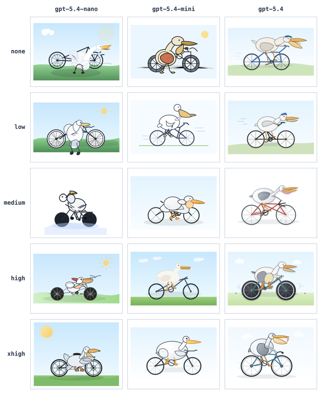 即便在创意任务上,如生成鹈鹕骑自行车的SVG图,nano和mini与满血版GPT‑5.4仍有一定差距,但它们完成基础创作任务完全可行。