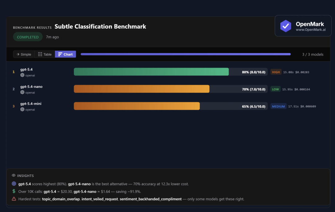 在分类任务中,nano准确率达70%,成本比GPT‑5.4降低十二倍。