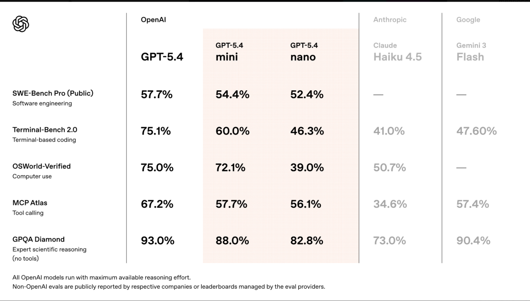 值得注意的是,在多个评测中,mini/nano模型与满血版GPT‑5.4的差距已经不大,性能上也基本与谷歌,Anthropic的轻量模型持平。