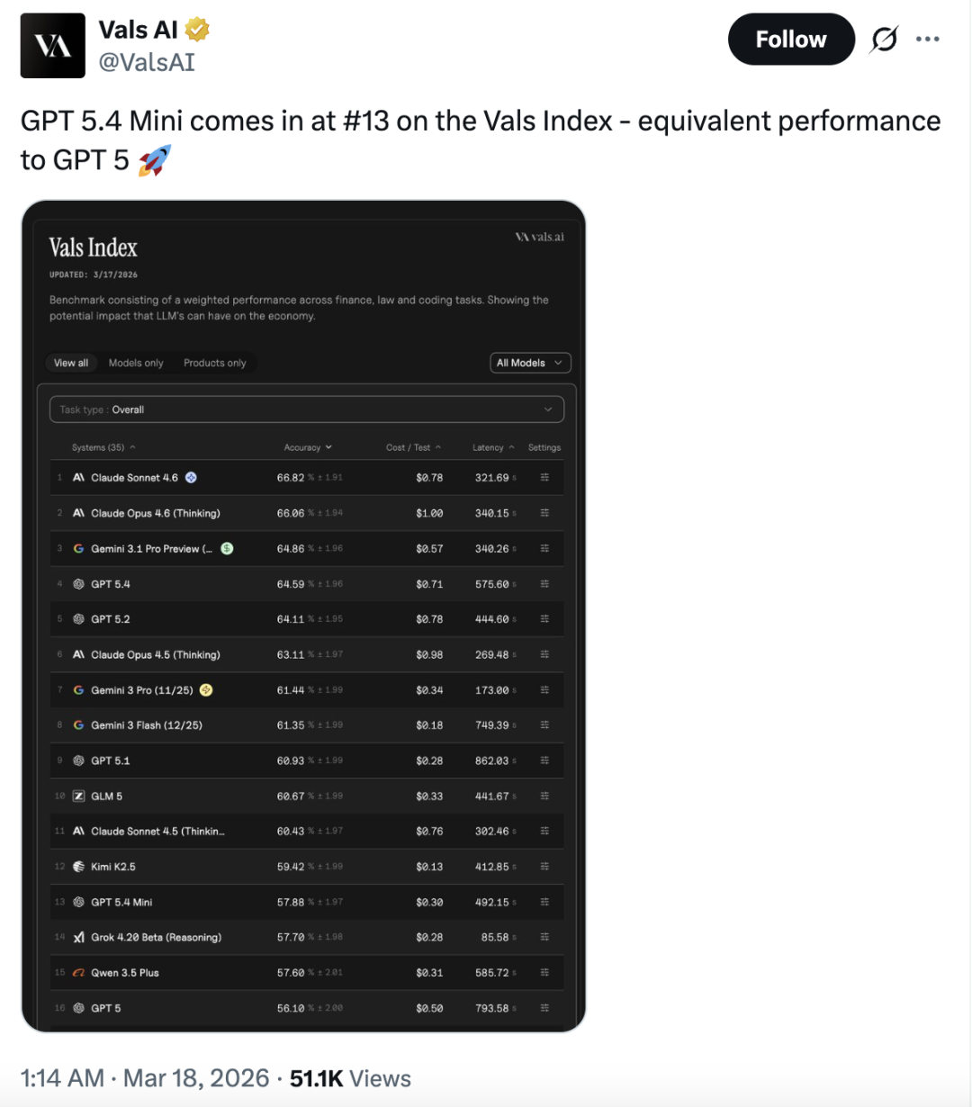 根据公开的大语言模型评测基准Vals,今天新出的GPT-5.4 mini仅排行第13名,优于OpenAI半年前发布的GPT-5。