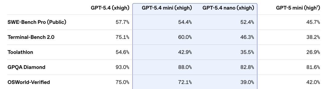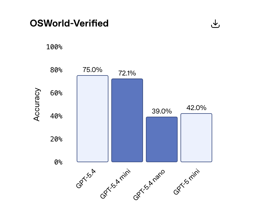 在OSWorld-Verified测试中,它的表现几乎接近满血版GPT‑5.4,同时明显优于GPT‑5 mini。