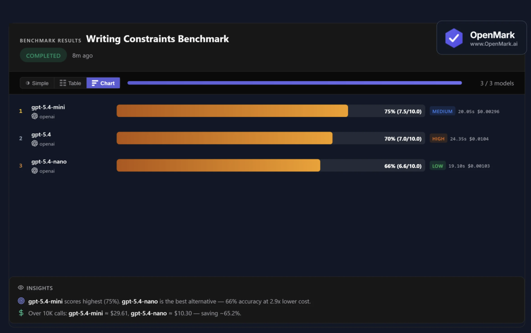 在写作任务中,mini版本反倒得分最高,成本比满血版低约六成。在超过1万次调用时,mini花费29.61美金,nano仅花费10.30美金。