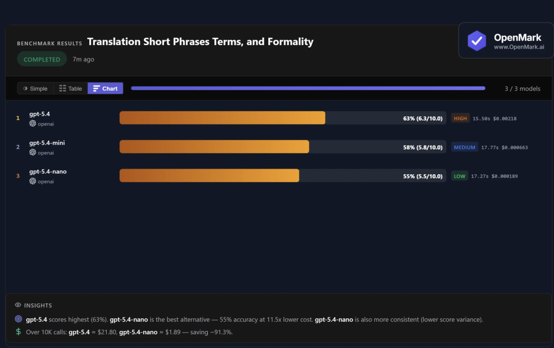 在翻译任务上,nano得分略低,为55分,但与GPT‑5.4的63分差距不大,仍可作为替代选择。在超万次调用后,节省幅度仍达到了91.3%!