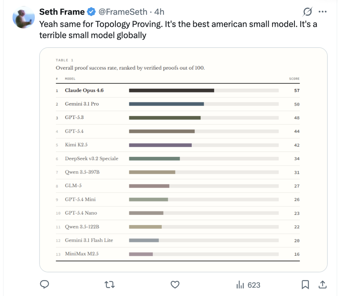 在同步的拓扑证明中,新出的mini和nano模型在全球范围内表现也只是中规中矩,分别排行第九第十,不如早前发布的Kimi、Qwen、DeepSeek等模型。