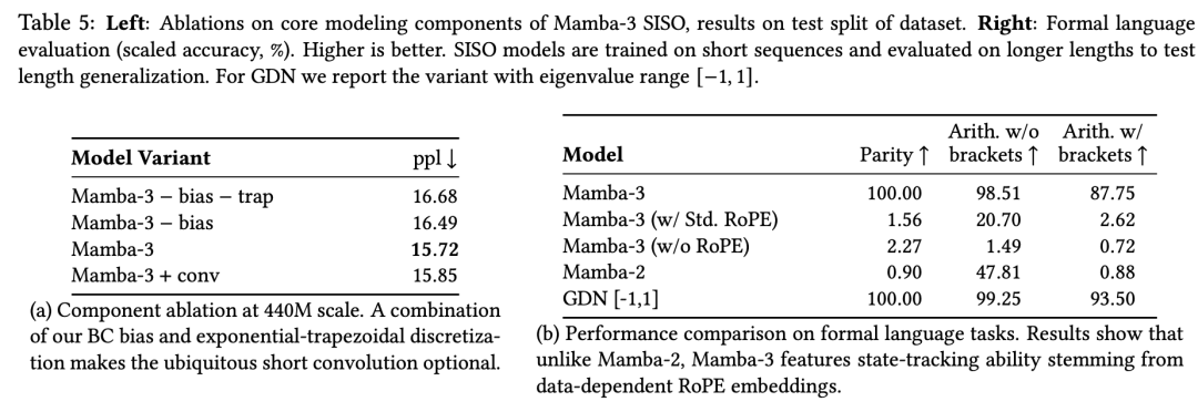 消融实验显示,指数梯形离散化与B、C偏置项的组合,能够完全替代过去几乎所有线性模型都依赖的外部短卷积——这是架构简化的重要一步。