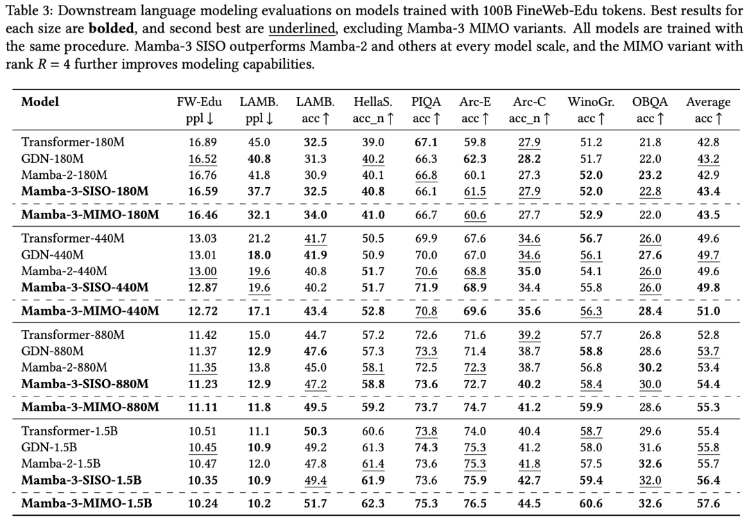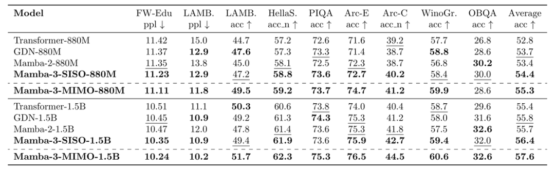 在15亿参数规模下,Mamba-3 MIMO版本的平均准确率达到57.6%,比Transformer高出4%。