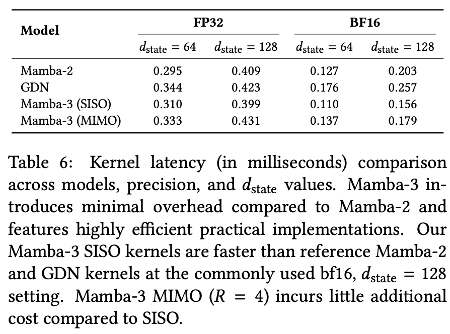 kernel延迟测试验证了这一点。在bf16、状态维度128的常用配置下,Mamba-3 SISO解码延迟仅0.156毫秒,比Mamba-2(0.203毫秒)还快;MIMO版本为0.179毫秒,依然快于Mamba-2。