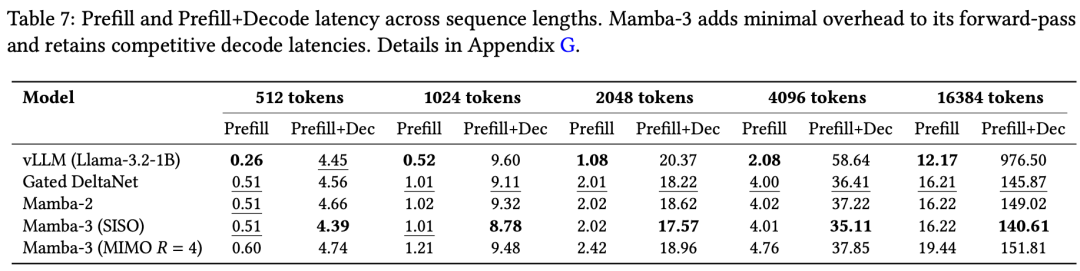 在端到端推理延迟上,16384个token的prefill+decode场景中,Mamba-3 SISO耗时140.61秒,而vLLM跑Llama-3.2-1B需要976.50秒,快了近7倍。