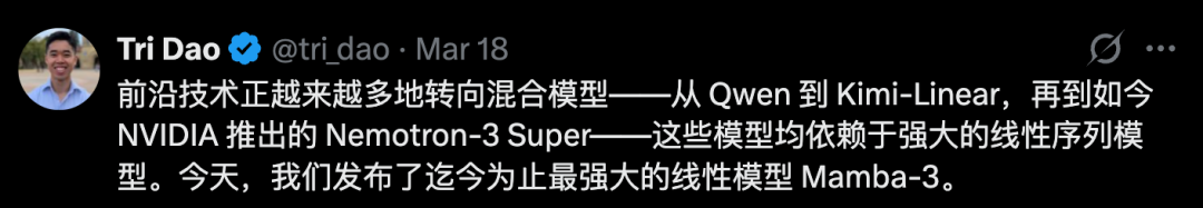 在X上,他的个人简介写着「leading the SSM revolution」(引领SSM革命),两年多内监督了Mamba三代架构的诞生。