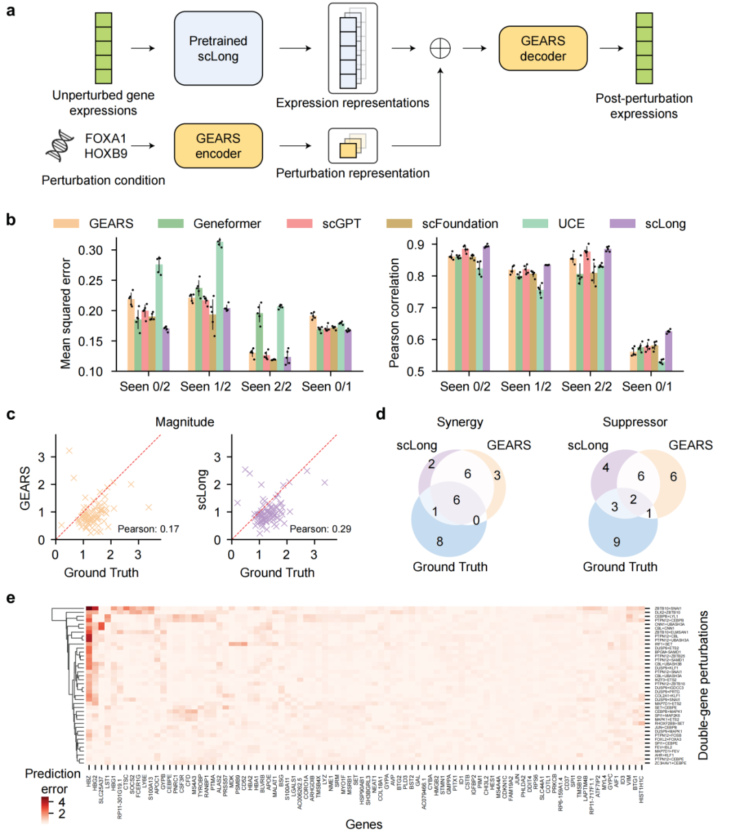 论文使用Norman数据集进行评测,并特别关注模型对未见过扰动组合的泛化能力。结果显示,scLong在大多数场景下都优于 Geneformer、scGPT、scFoundation、UCE,以及任务专用模型GEARS、ALM和简单基线No-Change。尤其是在更困难的Seen 0/1和Seen 0/2场景中,scLong的优势更明显:例如在Seen 0/1 场景下,scLong的Pearson相关系数达到0.625,高于GEARS的0.561;在Seen 0/2场景下,scLong的MSE为0.170,也优于多数基线。