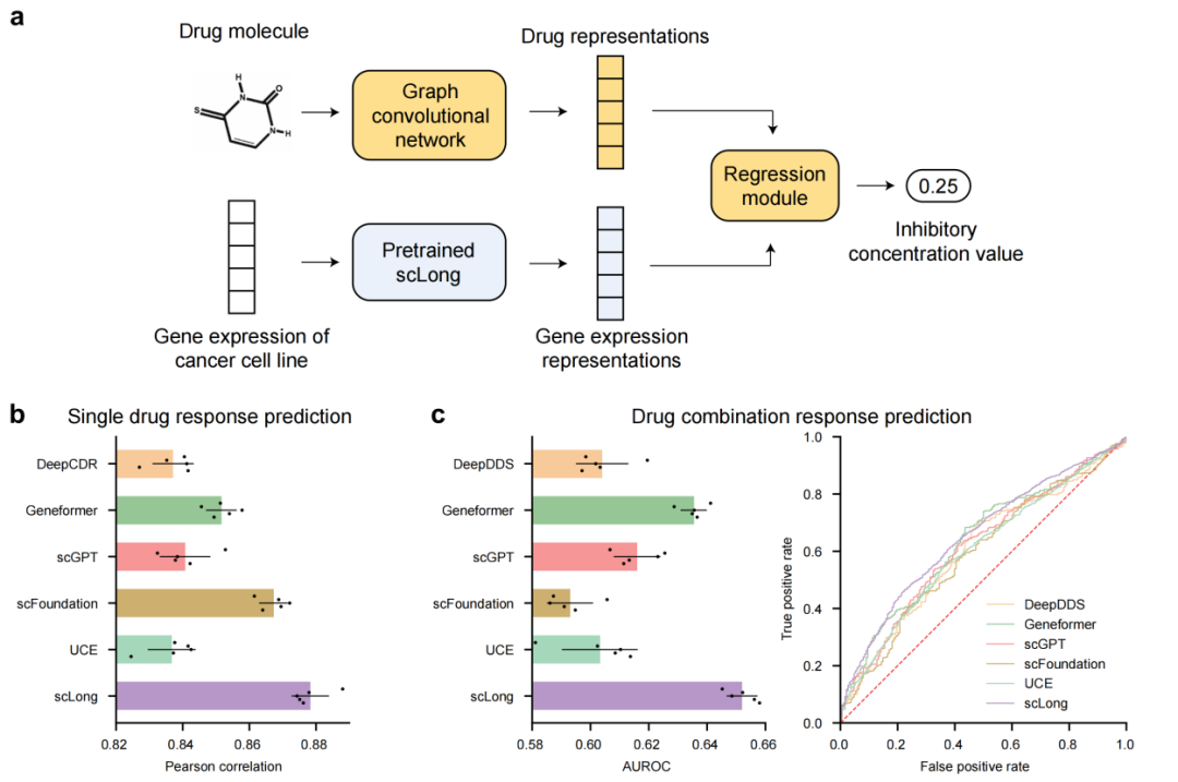 在癌症药物反应预测任务中,模型需要根据药物结构和癌细胞表达谱,预测药物疗效。论文在DeepCDR数据集上报告,scLong的Pearson相关系数达到0.878,高于Geneformer 的0.852、scFoundation的0.867、DeepCDR的0.837以及线性模型的0.746