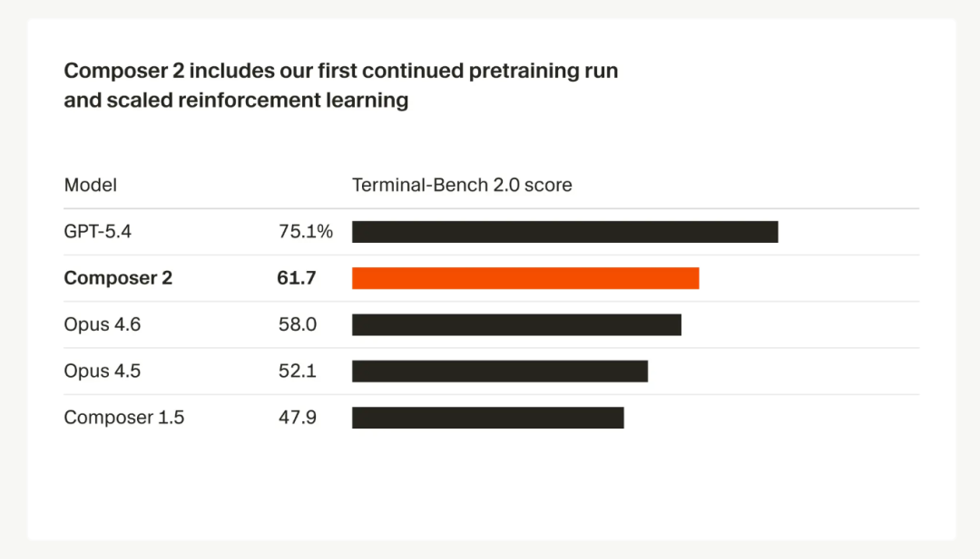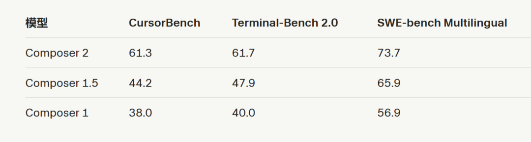 Composer 2在我们衡量的所有基准测试上都取得了大幅提升,其中包括Terminal-Bench 2.0和SWE-bench Multilingual。