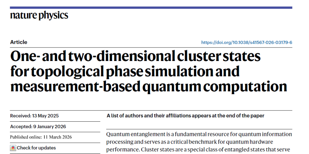 Jiang, T., Cai, J., Huang, J. et al. "One- and two-dimensional cluster states for topological phase simulation and measurement-based quantum computation." Nat. Phys. (2026).