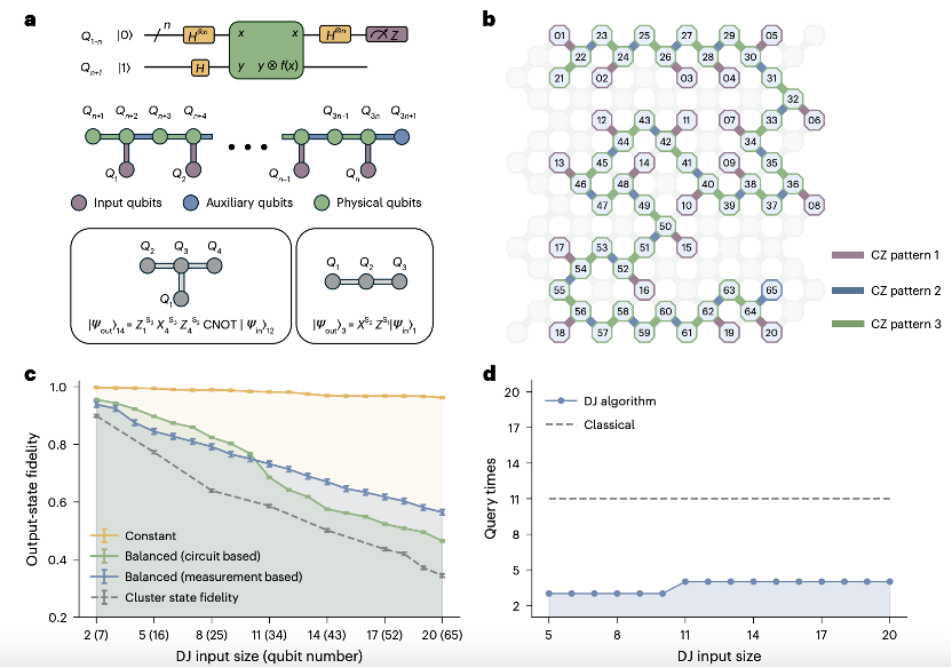 在算法层面,本文利用二维簇态实现了德意志-乔萨算法(Deutsch-Jozsa algorithm)的测量型版本。对于代表性的平衡函数,该实现最多涉及 20 比特输入、65 个物理比特。实验结果表明,随着输入规模增大,基于测量的实现仍保持较稳定的输出保真度;在 20 比特输入时,其输出态保真度达到 0.5643±0.0095,高于对应线路模型实现的结果。同时,在 99.9% 置信度下,它区分常函数与平衡函数所需的查询次数也优于经典方法。