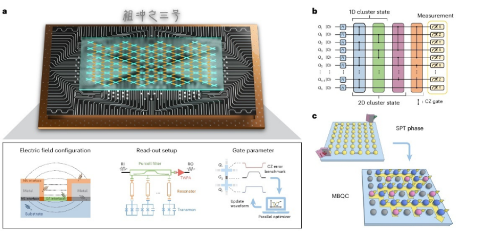 图1. 祖冲之 3.1 处理器及其实验思路示意图:在同一平台上,本文把大规模簇态制备、拓扑性质探测与基于测量的量子计算实验联系起来