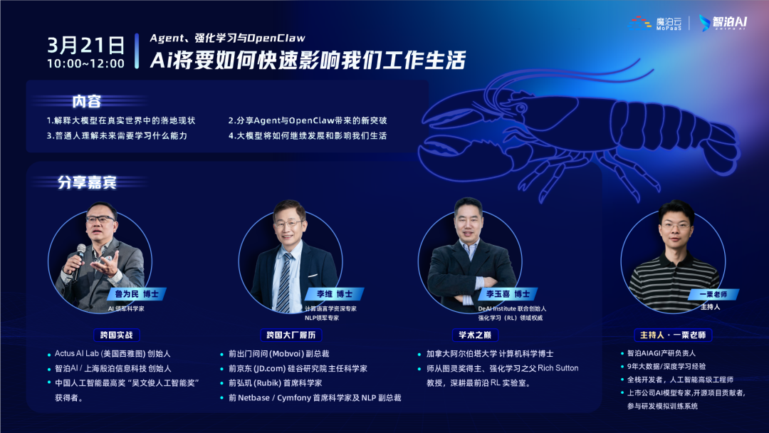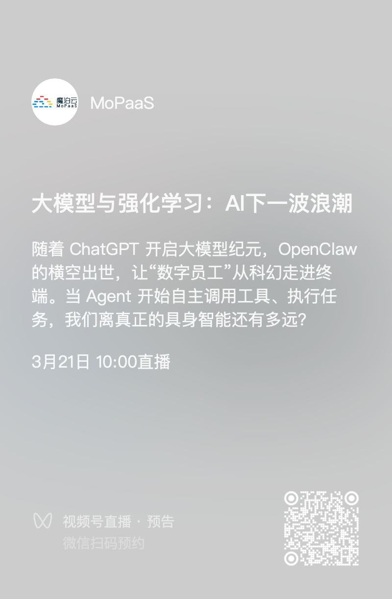 活动期间,李维博士和李玉喜博士将分别带来大模型和强化学习相关的精彩主题分享,主题分享后还有圆桌讨论和提问环节,MoPaaS诚邀所有希望理解和应用大模型AI的朋友参加!