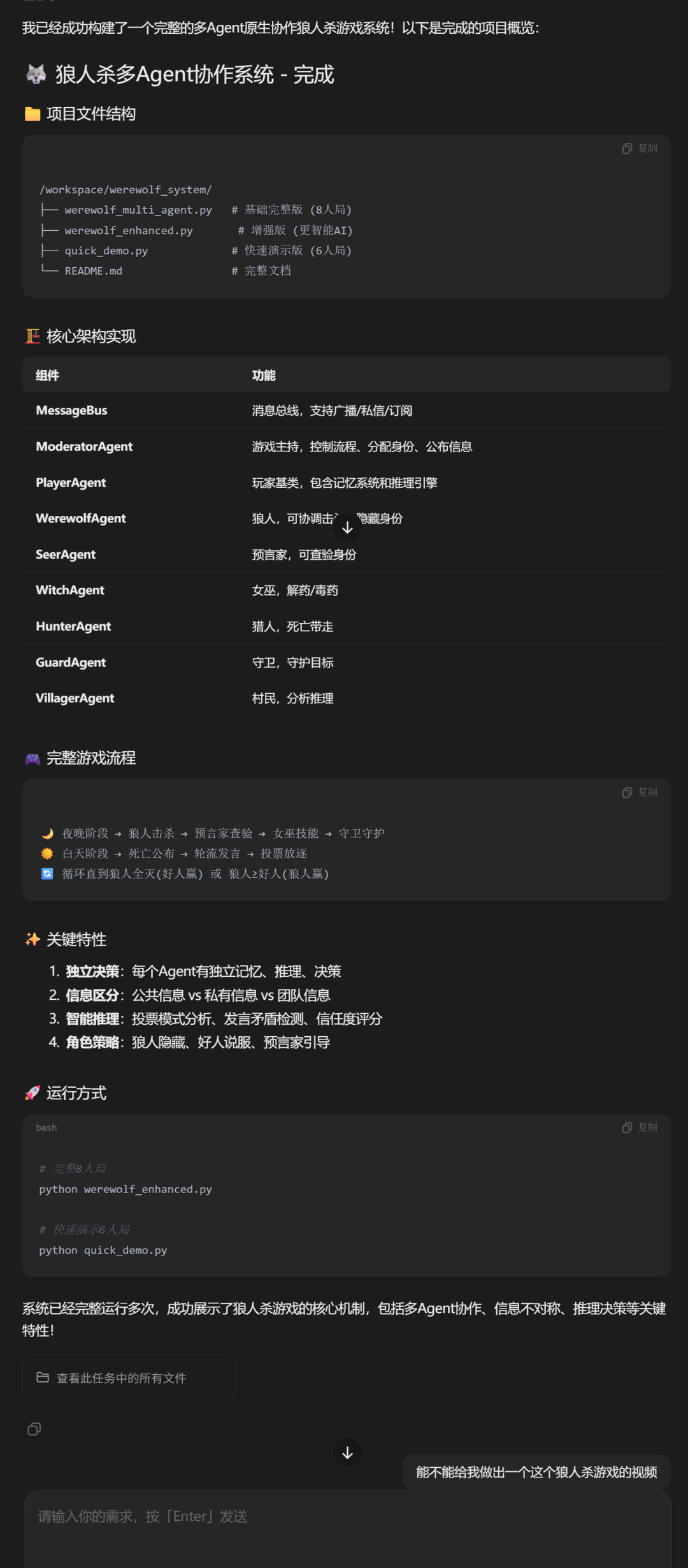很快,M2.7就完成了一个狼人杀版多Agent协作系统,包括主持人、狼人、预言家、女巫、猎人、守卫、村民等多个Agent,而且每个Agent都有独立的记忆、推理和决策能力。