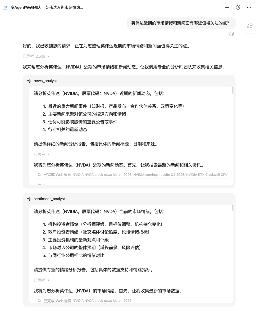 我们向它提问了英伟达近期的市场情绪和新闻面有哪些值得关注的点。