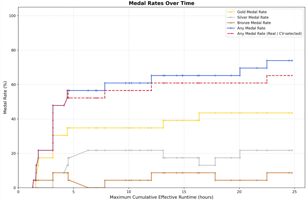 结果,在三次24小时的独立实验中,M2.7的表现随时间持续提升。最佳成绩为9金、5银、1铜,三次平均得牌率达到66.6%,与Gemini-3.1持平,仅次于 Opus-4.6(75.7%)和 GPT-5.4(71.2%)。