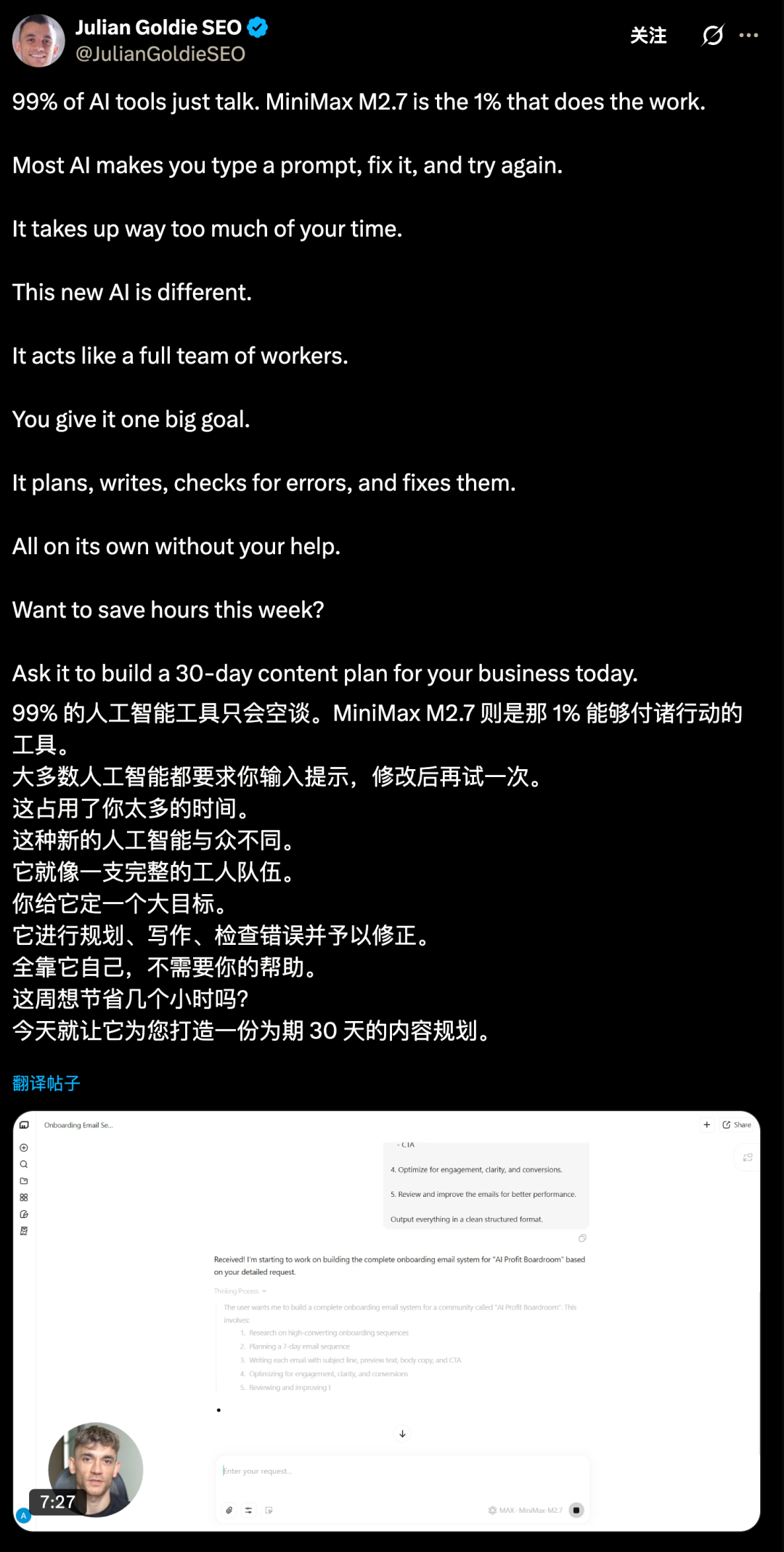 原本,这些工作都要人类团队协作完成,结果,M2.7竟然承担了其中30%到50%的工作流。