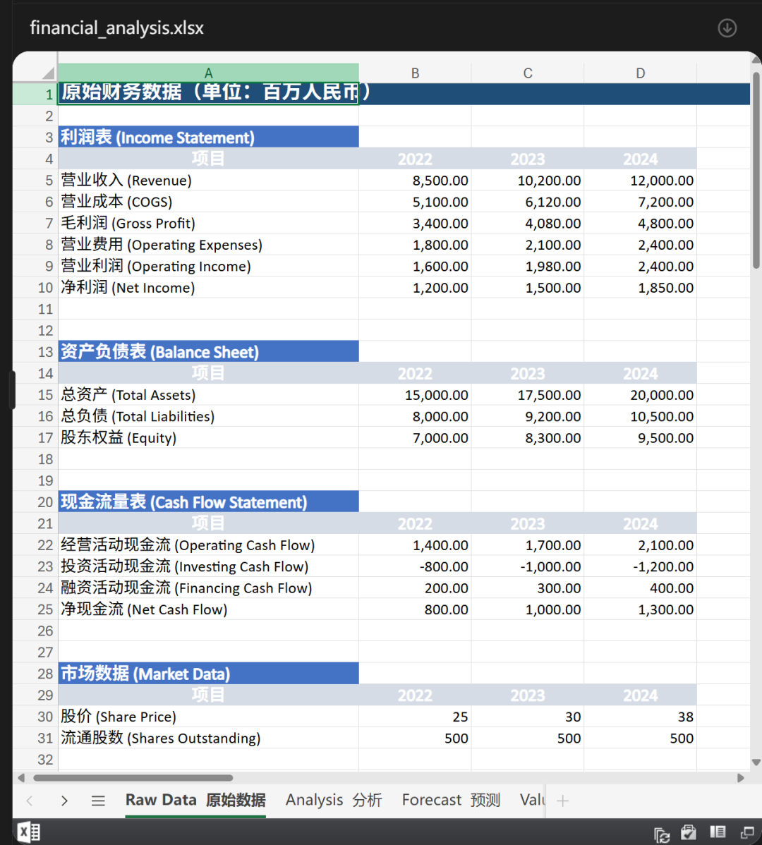 比如,下面是某上市公司近三年的财务数据(单位:百万人民币),我们要求M2.7在Excel中完成财务分析、预测及估值。