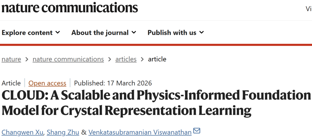 Xu, C., Zhu, S. & Viswanathan, V. CLOUD: A Scalable and Physics-Informed Foundation Model for Crystal Representation Learning. Nat Commun (2026).