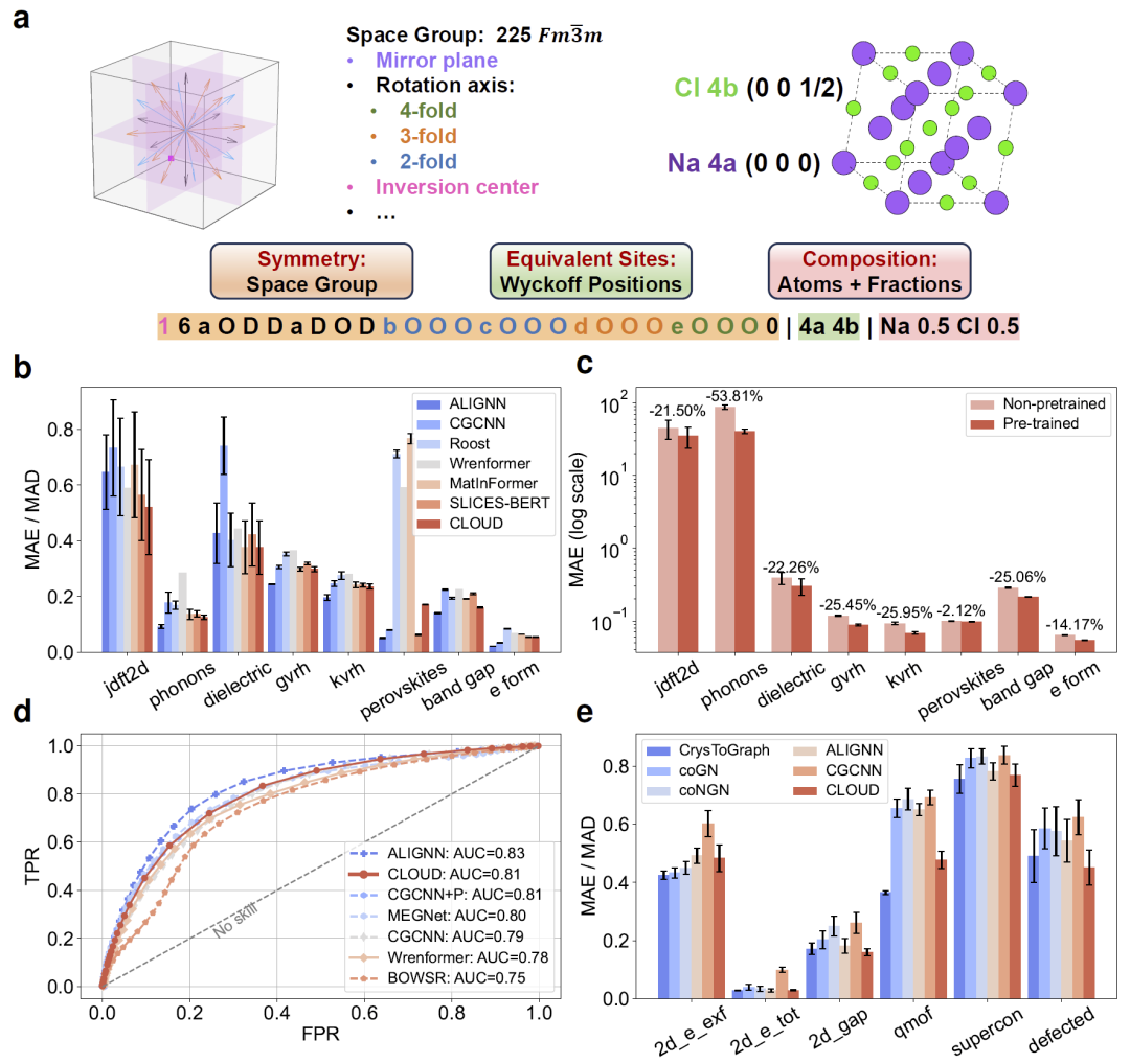研究人员提出一种可扩展的物理约束晶体基础模型 CLOUD,通过构建新的对称一致编码方式,将晶体的空间群、Wyckoff位置和组成信息表示为紧凑的字符串序列,并在数百万晶体数据上进行预训练。该模型在多种材料性质预测任务中表现出良好的可扩展性和泛化能力。进一步地,研究人员将模型与物理理论结合,实现可微分的材料建模,使模型能够预测温度相关性质并保持热力学一致性,展示了基础模型在材料科学中的潜力。