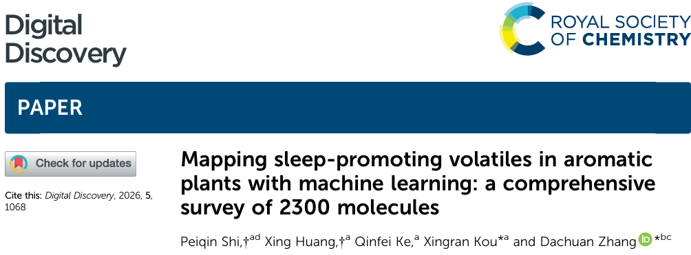 Shi, Peiqin, Xing Huang, Qinfei Ke, Xingran Kou, and Dachuan Zhang. "Mapping sleep-promoting volatiles in aromatic plants with machine learning: A comprehensive survey of 2300 molecules." Digital Discovery (2026).