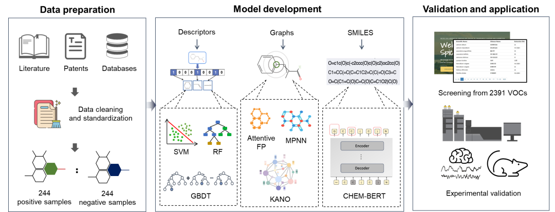 近期,上海应用技术大学柯勤飞、寇兴然团队,新加坡国立大学张大川团队,在Digital Discovery 发表研究,围绕芳香植物挥发性有机化合物的睡眠促进潜力展开了系统分析。研究通过整合大规模文献挖掘、机器学习建模与动物实验,对近1000种芳香植物中潜在的助眠挥发性分子进行了评估,并同时从分子层面和植物资源层面对其分布特征进行了探究。博士研究生时培钦与黄鑫副教授为共同第一作者,寇兴然教授与张大川博士为共同通讯作者。