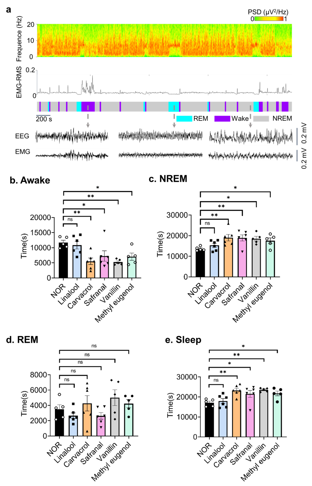 基于该模型,研究对 2391 种来源于芳香植物的挥发性分子进行了预测,其中绝大多数分子被判定处于模型适用域内。结合预测结果,研究进一步选择了具有代表性的5种候选化合物开展体内实验验证。通过小鼠脑电监测分析挥发性成分暴露后的睡眠结构变化,实验结果显示,其中4种化合物能显著延长总睡眠时长,主要体现在非快速眼动睡眠(NREM)的增加。进一步的蛋白表达分析显示,这些化合物与 GABA_A 受体相关亚基的表达变化存在关联。