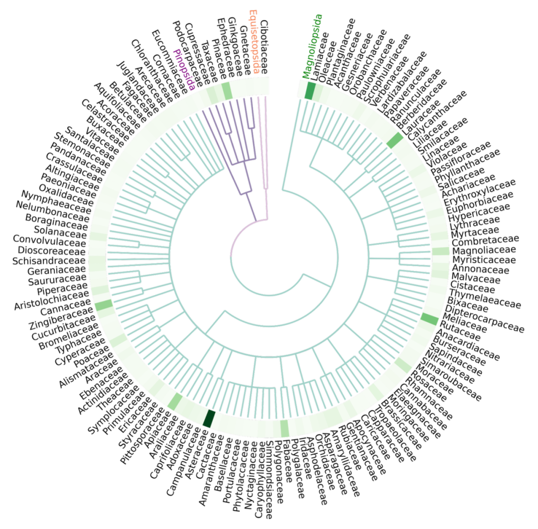 图3.991种芳香植物睡眠促进作用潜力概图。颜色越深,潜力越大。
