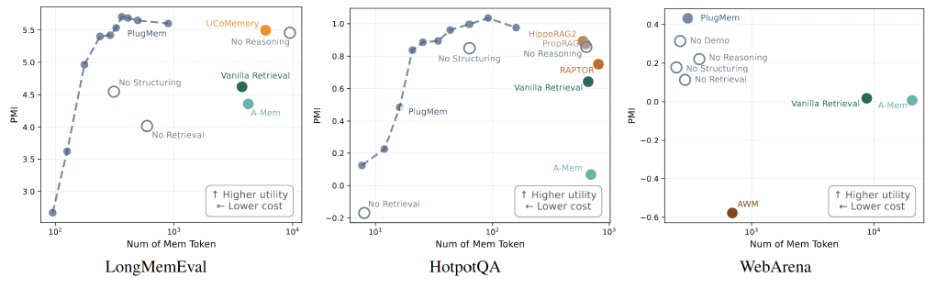 因此PlugMem工作中提出一个信息论指标,用来度量记忆系统每消耗一个智元(token),能带来多少「决策相关的信息增益」。直观地说:记忆模块产生的记忆智元(token)能让AI agent对正确行动更有把握多少?接着再按记忆长度做归一化。