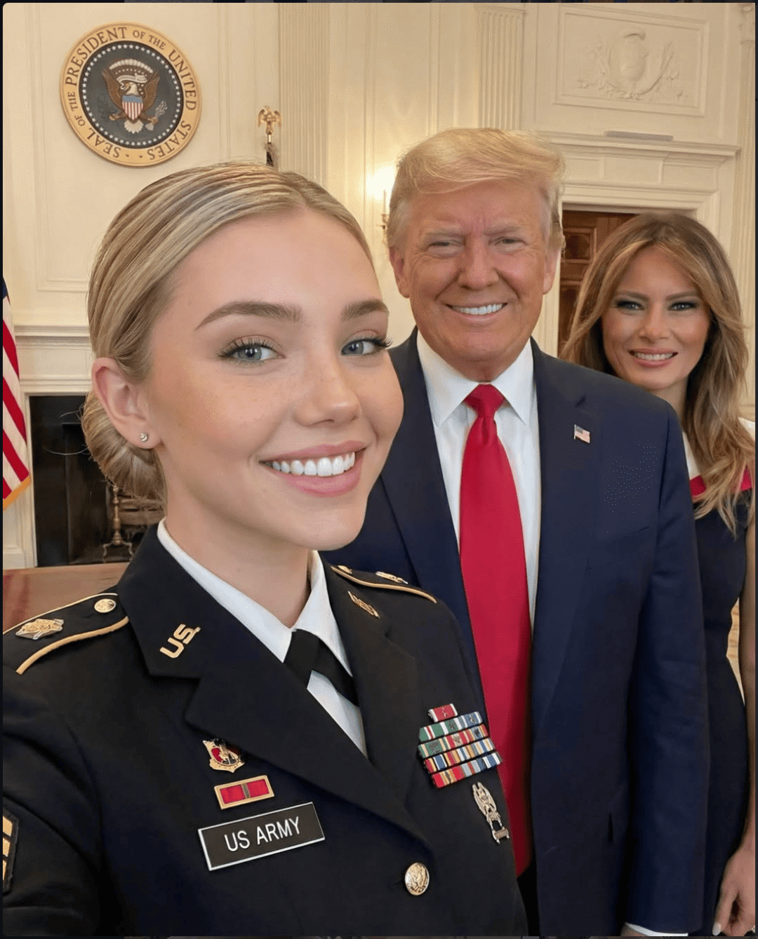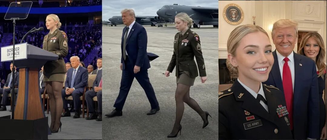 照片里,一位金发碧眼的美国女兵,时而身着迷彩服穿梭在中东沙漠,时而与特朗普总统在机场停机坪上并肩而行,甚至出现在与普京、泽连斯基的外交峰会现场。